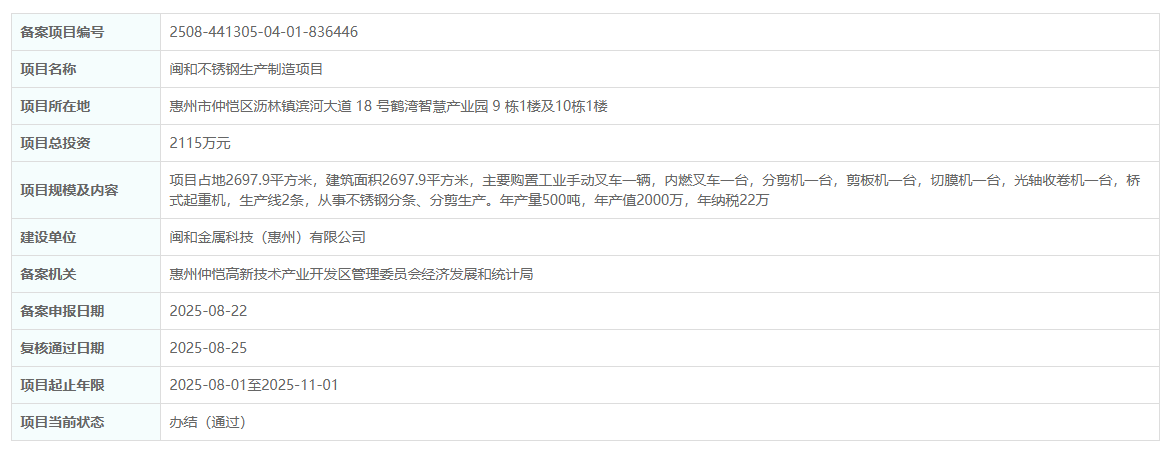 2025年8月25日,閩和金屬科技(惠州)有限公司閩和不銹鋼生產制造項目備案復核獲通過。